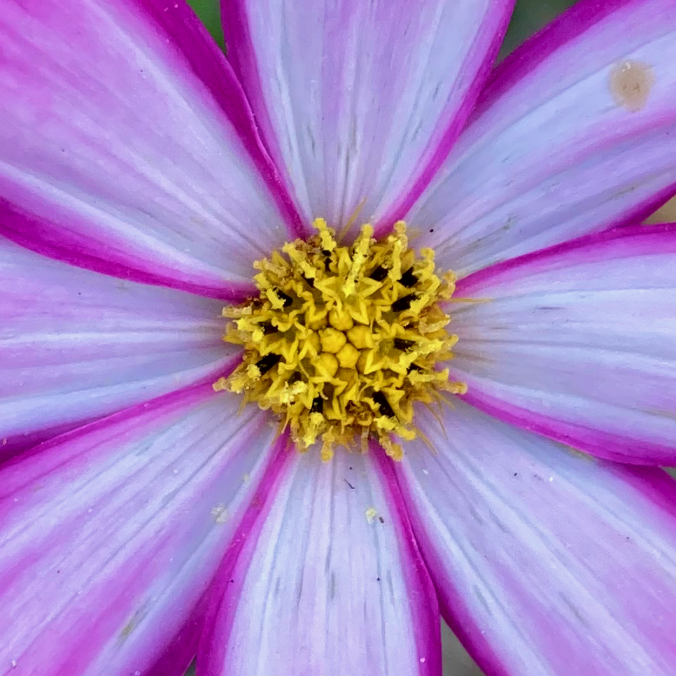 I took a picture of a cosmos blossom because I was intrigued by the pink edged ray flowers. I got home and downloaded the photo. When I reviewed the photo I noticed miniature stars emerging from the disk! Is that why the plant is called “cosmos?”