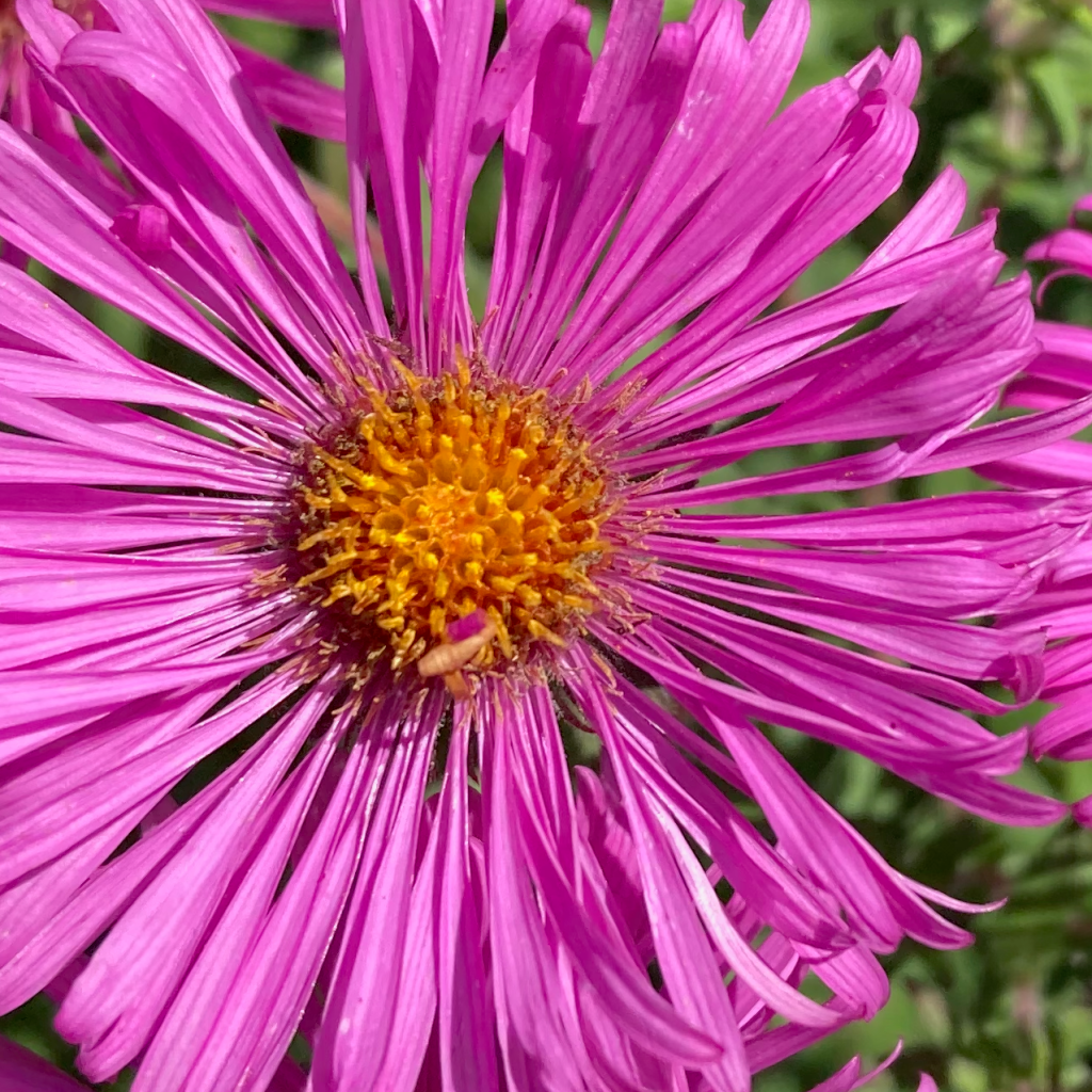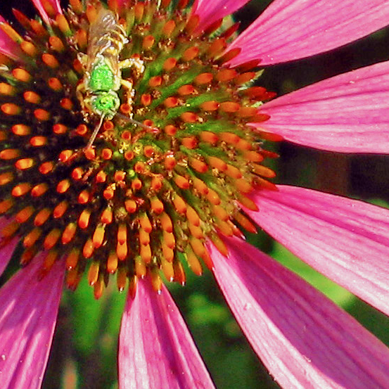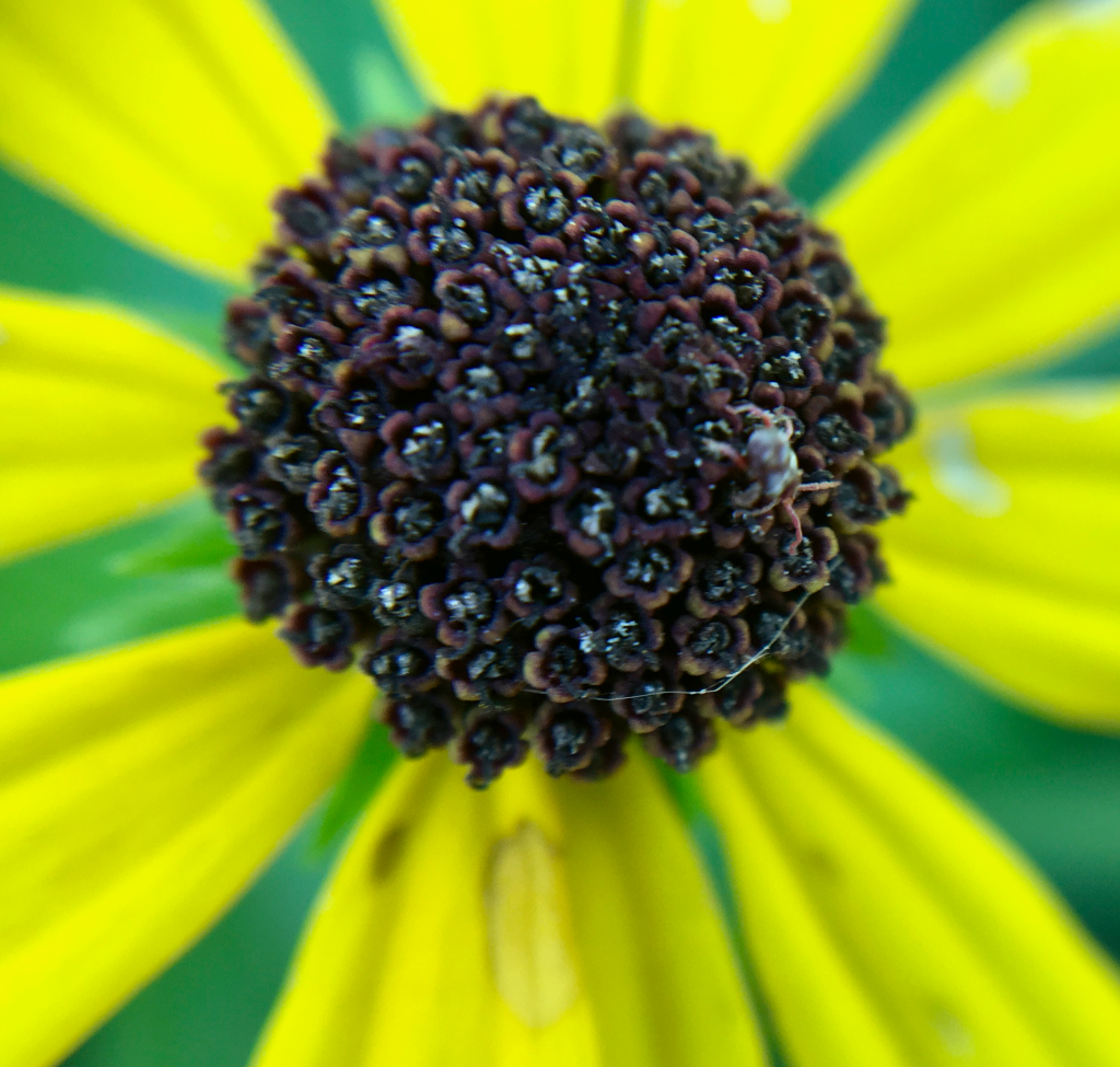 That started me thinking about purple cone flower (PCF) with its tiny yellow stamens emerging from a forest of orange spikes. I have in the past imagined disk flowers to all be little fields of fuzzy yellow (or brown). I’d noticed standouts like PCF and zinnia before but cosmos made me realize that I should be paying closer attention to these smaller scales of existence. Note the mite on the rudbeckia.